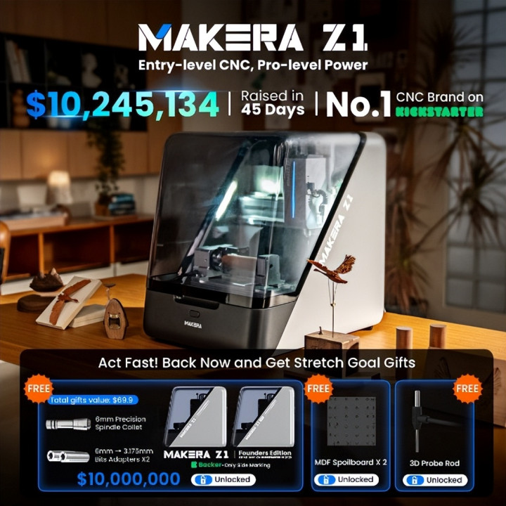 时间来到 2025 年,Makera 在德国柏林举办的 IFA 展会上发布入门级型号 Z1,斩获“最佳内容创作奖”。随即通过众筹平台 Kickstarter 一炮而红,上线仅 5 分钟便突破了 10 万美元的初始目标;24 小时后冲破 300 万美元;12 月 13 日结束时,总金额已达 10,248,561 美元(约合人民币 7,380 万元),是初始目标的 102 倍,有 7,420 名支持者,这直接刷新了桌面 CNC 品类的众筹纪录。同年 10 月,公司完成数千万元人民币的 Pre-A 轮融资,主要用于研发、生产线扩展和国际营销。
