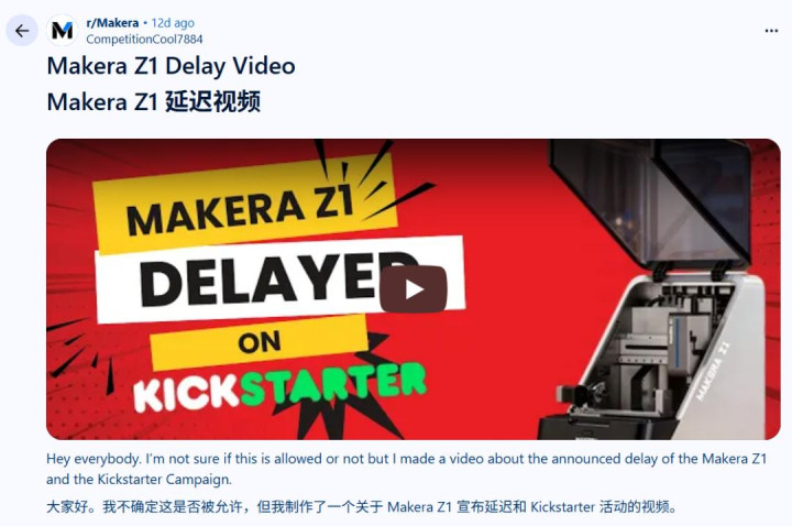 由于时差和团队规模限制,公司在国际市场的客户支持响应也相对较慢。Kickstarter 众筹结束后,面对“泼天流量”,Makera Z1 部分批次的交付日期被推迟了两个月至今年 3~4 月,产能困境已经初见端倪。